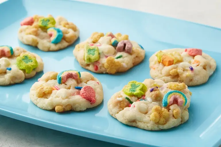 ¡Una sencilla manera de hacer que cualquier día sea mágicamente delicioso! Todo lo que necesitas es una mezcla de galletas de azúcar, cereal Lucky Charms™ Honey Clovers, chispas de chocolate blanco para hornear y chispas multicolores para esta divertida y colorida galleta.