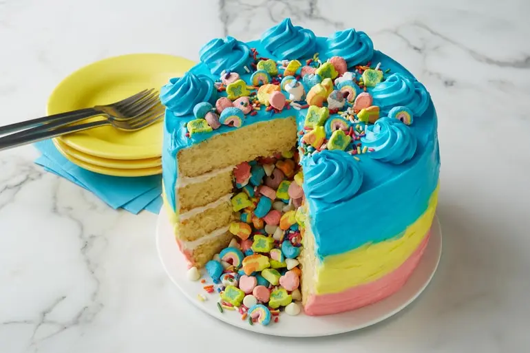Este impresionante y mágico pastel seguramente será el más pedido por los pequeños duendes en tu vida. Córtalo para revelar una sorpresa secreta: ¡un centro lleno de malvaviscos Lucky Charms™, chispas multicolores y mucho más!